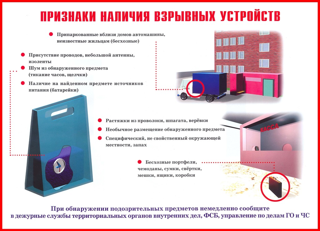 Помните: внешний вид предмета может скрывать его настоящее назначение. В качестве камуфляжа для взрывных устройств используются самые обычные бытовые предметы: сумки, пакеты, коробки, игрушки и т.п.